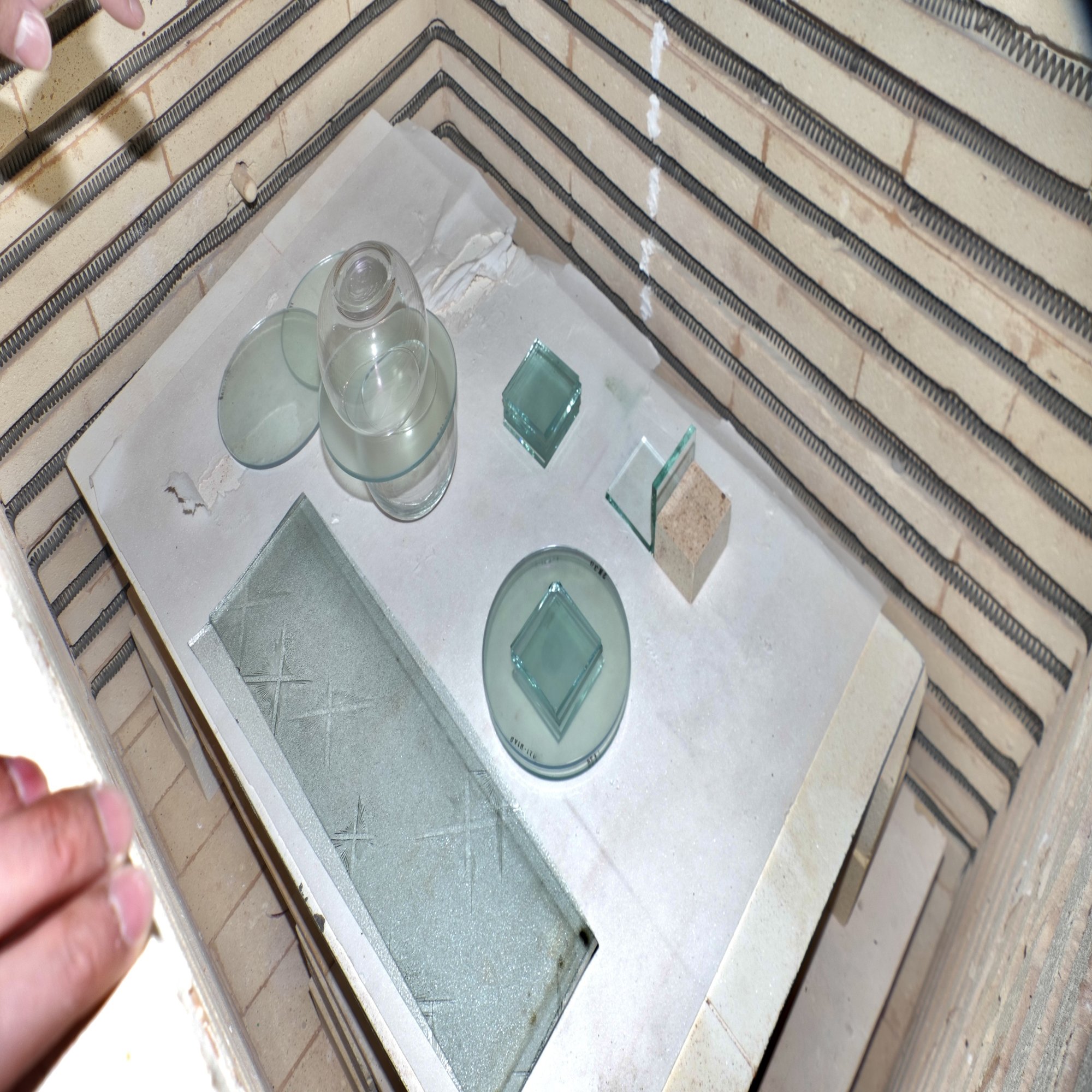 その後、どう配置したらどう曲がるのかを考えながら実際にガラスを耐熱ブロックの上に配置した。下の画像は板ガラスを縦に捻るためにはどう置いたら良いかを試行している様子だ。