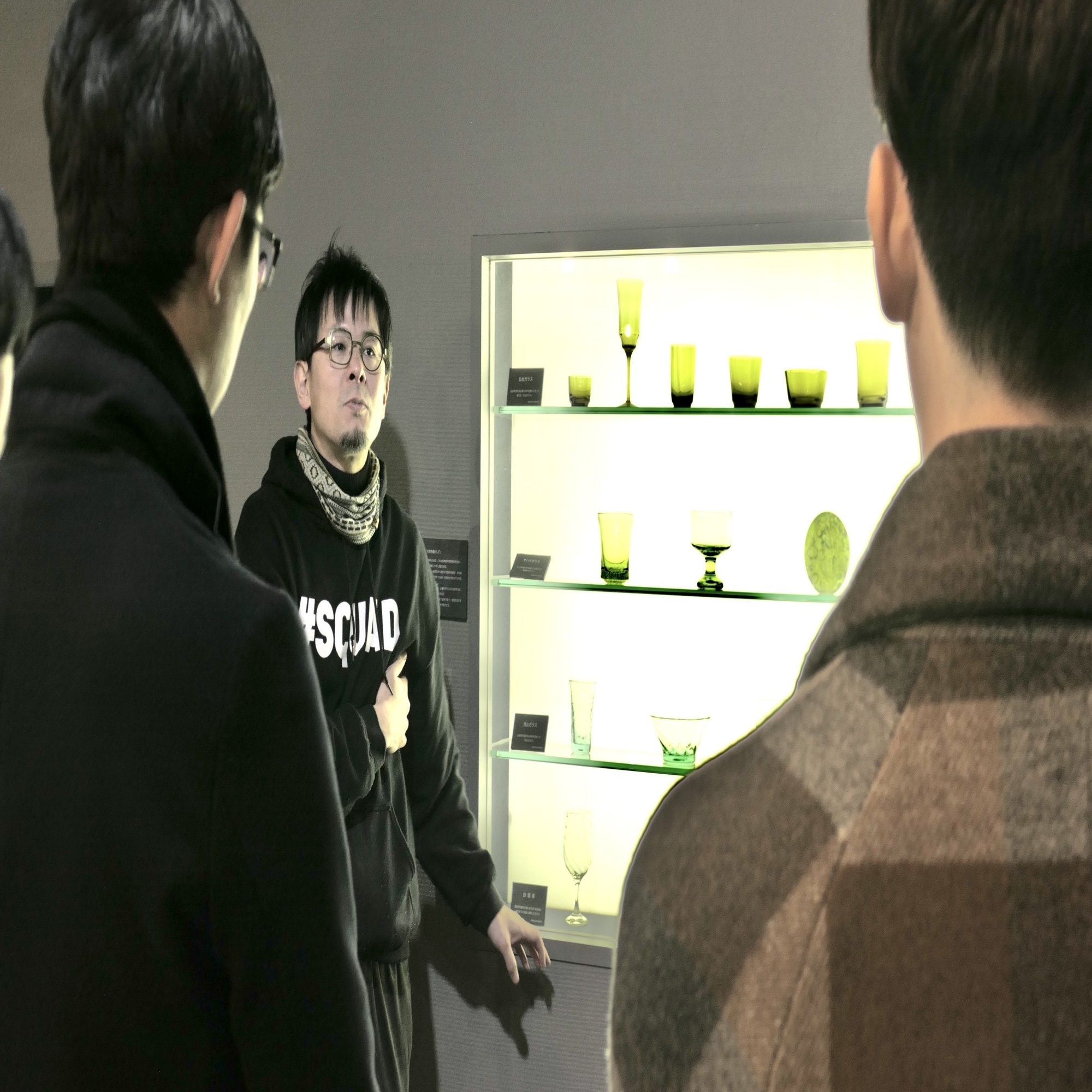 ガラスがどこの砂からつくられ、そしてどのようにガラスになるのかという素材循環の入口。そして溶解炉の温度がマグマとほぼ同じであることから想起される地殻変動。素材が腐食していく素材循環の終盤。長く残るガラスが刻む私たちの営みの記憶。中川さんから地球を想起させる壮大な作品たちの解説を聞きながら、私たちはガラスが地球の素材であるという事実を目の当たりにしつつ、ガラスへの向き合い方も再び考えさせられた。