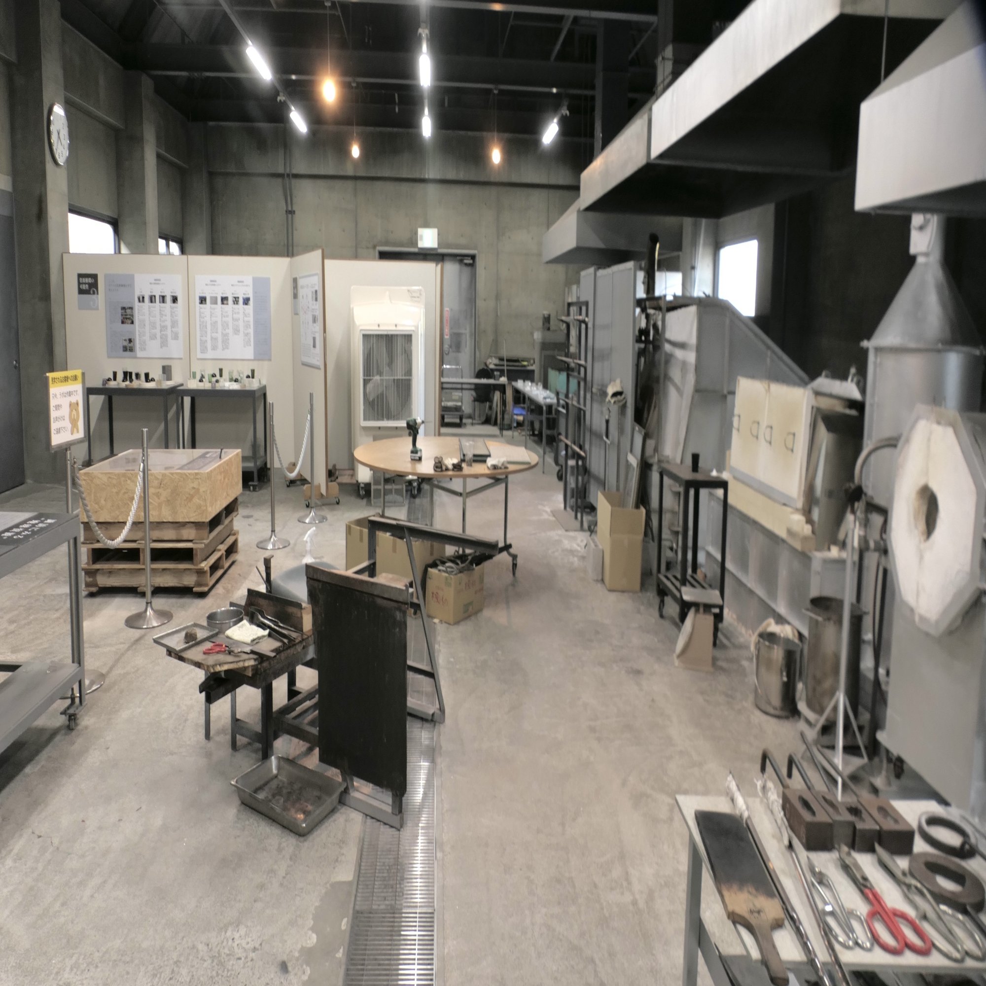 SUWAガラスの里のラボと美術館を巡るツアーが終わり、先ほどリヒート処理をしたオープンラボに戻り、 ラボの成り立ちや施設について説明を受けた。 次の体験として、このラボでは実際にリユースガラスの回収につながる、窓サッシの解体やガラス切断を体験してみることに。 先立って、ガラスの危険性や保護具などの安全なガラスの取り扱いについてのレクチャーを聞いて、気を引き締めて体験へ。