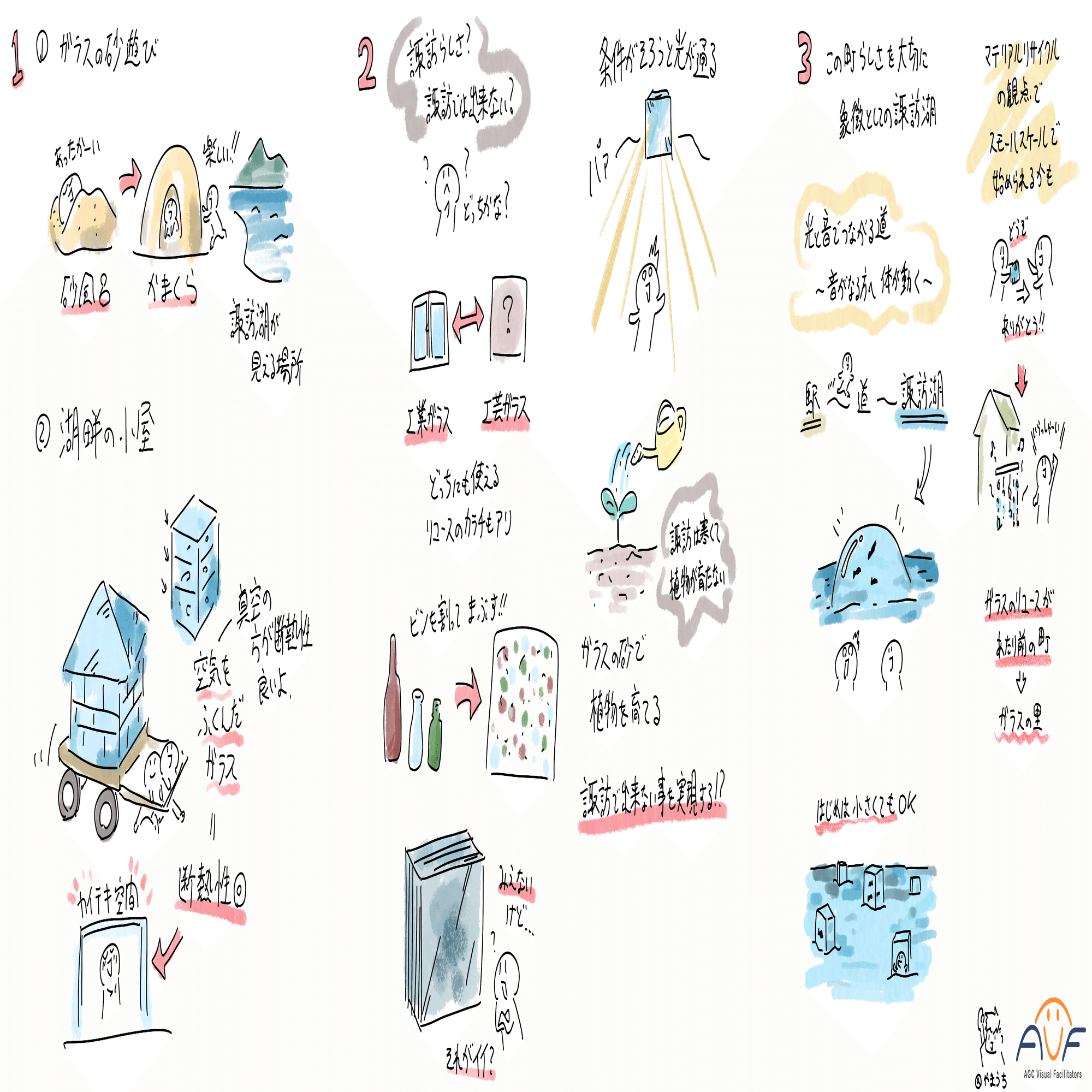 昨日のワークショップでは、各チームが「ガラスの特性」「循環とは何か」「諏訪でやってみたいこと」についてたくさんのアイデアを出し、それらの要素をつなぎ合わせることで、アイデアを深めようと試みた。